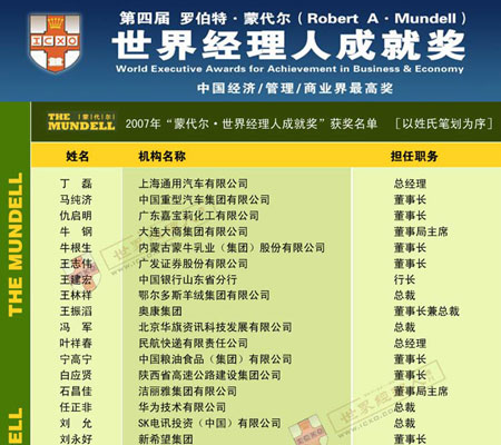 “蒙代尔世界经理人成就奖”是目前国内经济、管理、商业领域的最高奖项,由蒙代尔教授授权的《世界经理人》周刊、《蒙代尔》杂志(中文版)和美国《哥伦比亚新闻评论》(中文版)等50家领先的财经和管理媒体联合评选,提名专家和评选委员阵容强大,包括财经记者、行会领导、经济学家、管理学家、商学院院长、咨询公司总裁等100名经济和媒体专业人士。