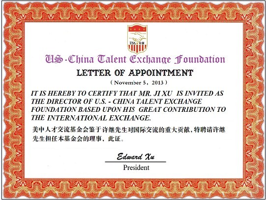 美中人才交流基金会鉴于我公司许继董事长对国际交流的重大贡献,特聘请许继董事长担任该基金会理事。