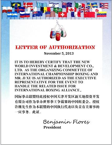 我公司与国际拳击联盟(International Boxing Alliance)签署战略合作协议,获该联盟在中国赛事全面代理权。特授权我公司许继董事长为该联盟中国执行代表,全面负责该联盟在华赛事及相关事务。